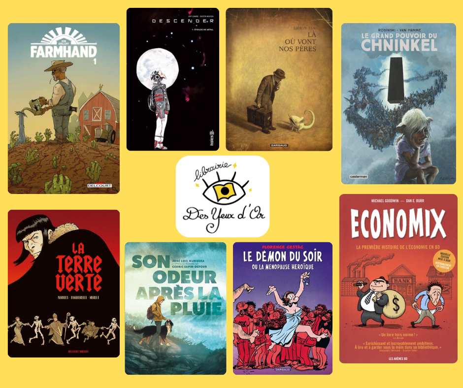 Voici les quelques titres coups de cœur dont nous avons parlé ensemble : « Farmhand » de Guillory, « Descender » de Lemire et Nguyen, « Là où vont nos pères », de Shaun Tan, « Le grand pouvoir du Chninkel » de Van Hamme et Rosinski, « La terre Verte » de Ayroles et Tanquerelle, « Son odeur après la pluie » de Munuera, « Le démon du soir » de Cestac, ou encore « Economix » de Goodwin et Burr. Des titres récents, d’autres plus anciens, de l’humour, de la BD documentaire, de la Science-Fiction, de la poésie… un aperçu de la richesse et de la diversité de l’univers de la Bande dessinée !