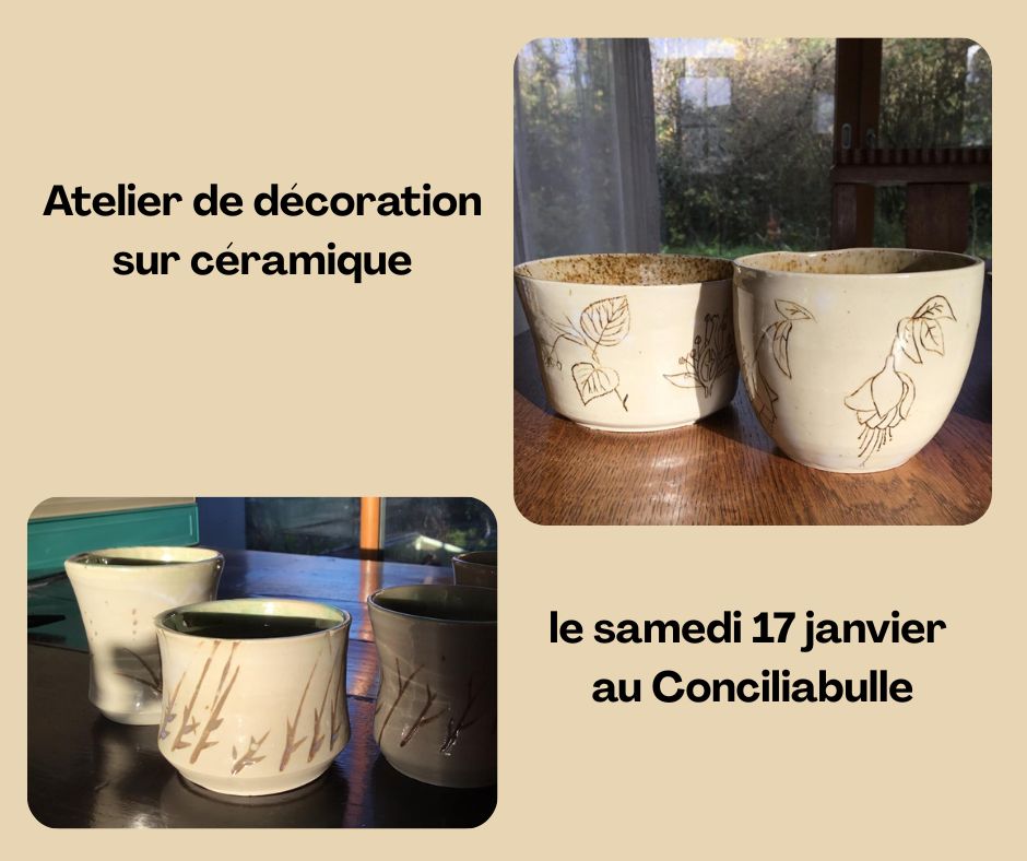 Samedi 17 janvier 2026 de 15h à 17h : Atelier de décoration sur céramique