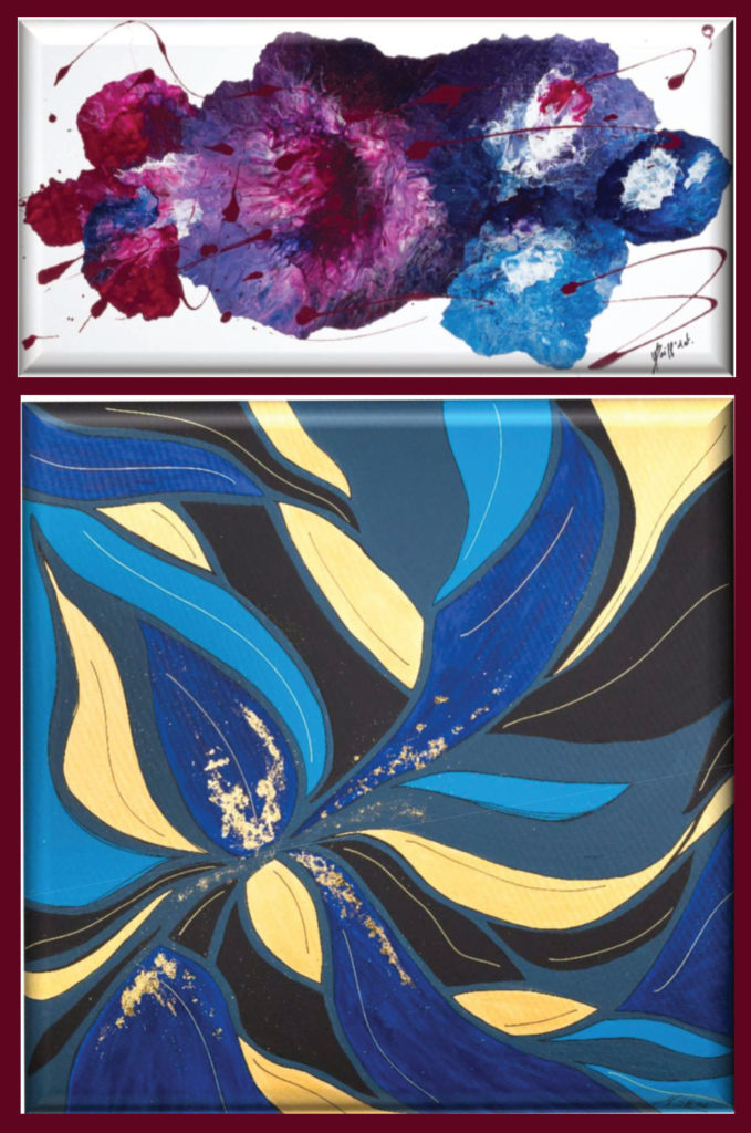 Actuellement sur une série florale, mes dernières peintures explorent des thèmes liés au mouvement fluide, à l’harmonie des couleurs et à l’énergie organique dégagée.