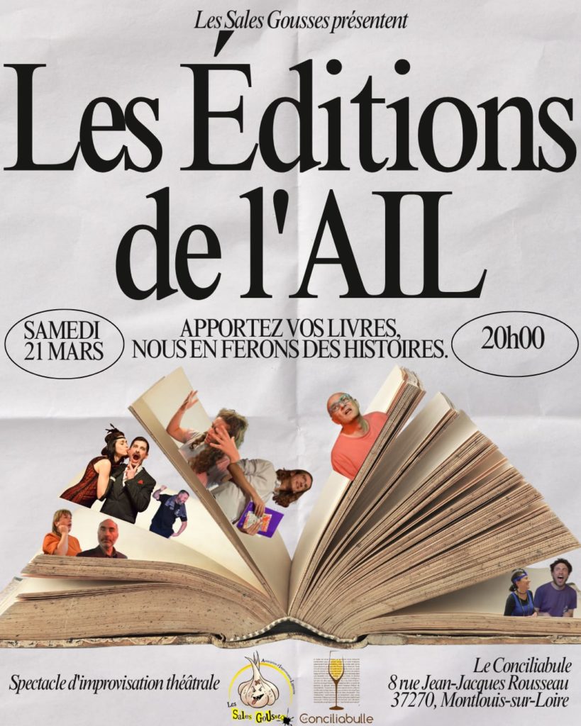 Le spectacle présenté au Conciliabulle est une nouvelle création : « Les Editions de l’AIL » Des éminent-es et improbables critiques littéraires vont donner une seconde vie improvisée aux livres apportés par le public.>>> Apportez vos livres, nous en ferons des histoires !